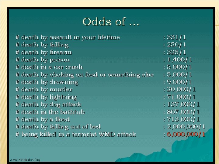 Approximately 1 in 5 people who are infected with West Nile virus will develop symptoms such as fever, headache, body aches, joint pains, vomiting, diarrhea, or rash. Less than 1 percent will develop a serious neurologic illness such as encephalitis or meningitis (inflammation of the brain or surrounding tissues) 1 in 10 people who develop neurologic infection due to West Nile virus will die. Up to 80% of infected persons have few or no symptoms. … People over 50 years of age and those with certain medical conditions, such as cancer, diabetes, hypertension, kidney disease, and organ transplants, are at greater risk for serious illness. Numbers Game *100 people infected = 20 people will get sympt. *0. 75 people develop neurologic sympt. (Of those 10% will die) = 0. 075 2500 immune compromised people infected for 1 death