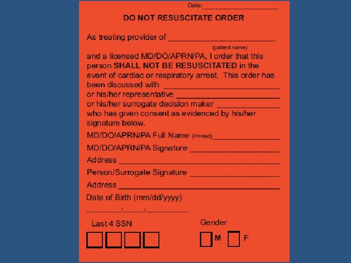 Decision-Making for Patients without Capacity n n n Based on Advance Directives n with MPOA representative if named n according to the Living Will Based on medical orders n Physician Orders for Scope of Treatment (POST) n Do Not Resuscitate card Based on Best Interests n with MPOA representative if named n with health care surrogate