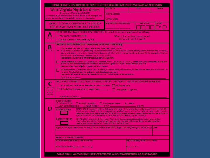 The POST Form in West Virginia Code n n a STANDARD form LEGALLY recognized DNR identification legal PROTECTION--health care providers are not subject to civil or criminal liability for good faith compliance with or reliance upon POST protocol for interinstitutional TRANSFERS
