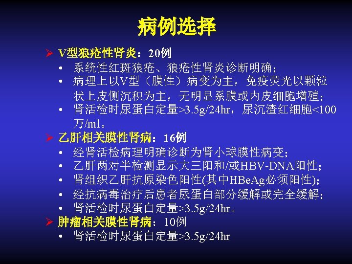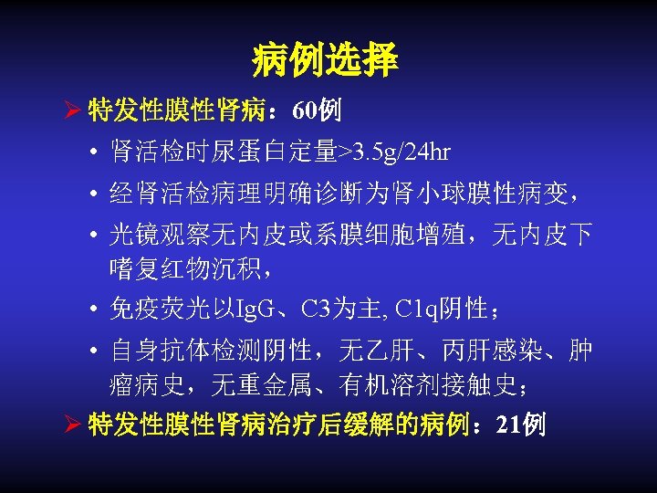 Follow-up of tumor-MN Ø All three patients with Anti-PLA 2 R : persistent or relapse of proteinuria despite resection of the tumor. Ø In those patients without anti-PLA 2 R: • 2 patients: complete remission of the proteinuria after tumor resection; • 3 patients died of cancer; • The remaining 2 patients had persistent proteinuria without tumor resection.
