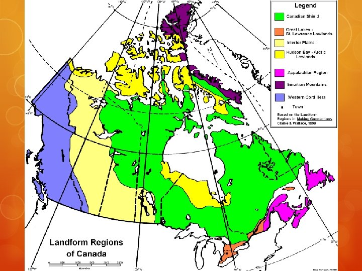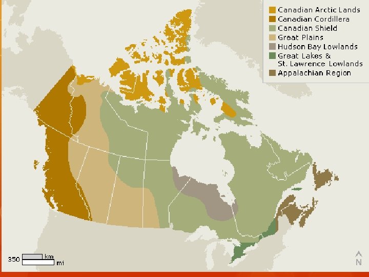 Canadian Shield ○ Location: Takes up over half of Canada and some of the United States. Central Canada. ○ Appearance: Relatively flat with rounded hills of rock that were once mountains. Composed of Igneous and Metamorphic rock. Has many lakes and rivers in addition to vast forests. ○ Formation: Formed by volcanic action millions of years ago that eroded the mountains that once existed there. ○ Industries: Rocks contain minerals that are good for mining. Many lakes and rivers are good for recreational tourism (fishing, hunting, cottages). Many rivers are well suited to hydroelectricity.