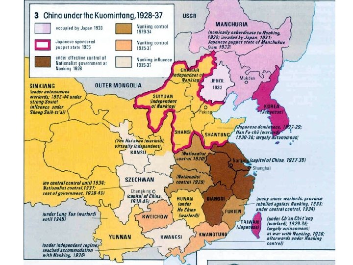 China under Chiang Kai-Shek • Japanese encroachment – 1928, Shandong Province – 1931, Manchuria • 3 provinces – 1932, Shanghai – 1933, Northern China • suburbs of Beijing – 1937, full-scale aggression started • Beijing and Shanghai