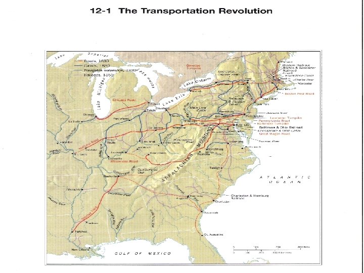 Transportation Revolution: Turnpikes and National Road • By 1832, nearly 2400 mi. of road connected most major cities. • National Road connected east with west (Maryland to western Illinois) and partially funded by federal government. First Turnpike Lancaster, PA (1790)