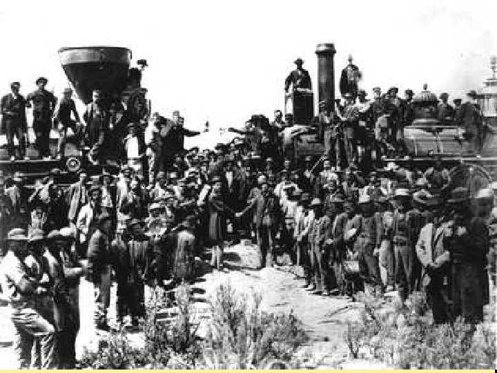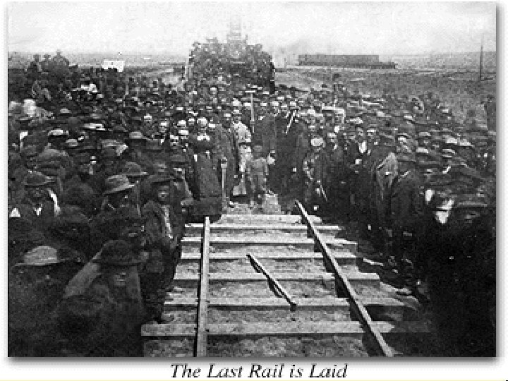The Golden Spike • On May 10 th, 1869, at Promontory Point, Utah, the “Golden Spike’ was driven into the ground uniting both the Union Pacific and Central Pacific Railroads • 1 st railroad line connecting the East to the West • Travel time about 4 -5 days from NY to California • Considered one of the greatest architectural achievements in American History • Nothing could stop Manifest Destiny • Video Clip