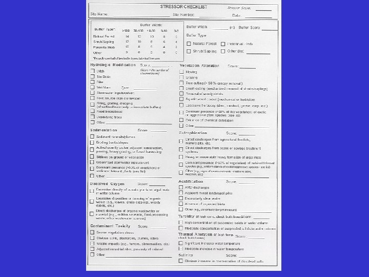 Stressor Checklist • Hydrologic Modification • Sedimentation • Dissolved oxygen • Contaminant toxicity • Vegetation alteration • • • Eutrophication Acidification Turbidity Thermal Alteration Salinity