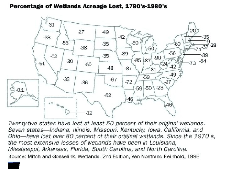 Major Effects of Wetland Losses n 50% loss of spawning grounds for fish n 50% loss of waterfowl habitat n 50% loss of flood control capability n 50% loss of erosion control and sediment-trapping capability