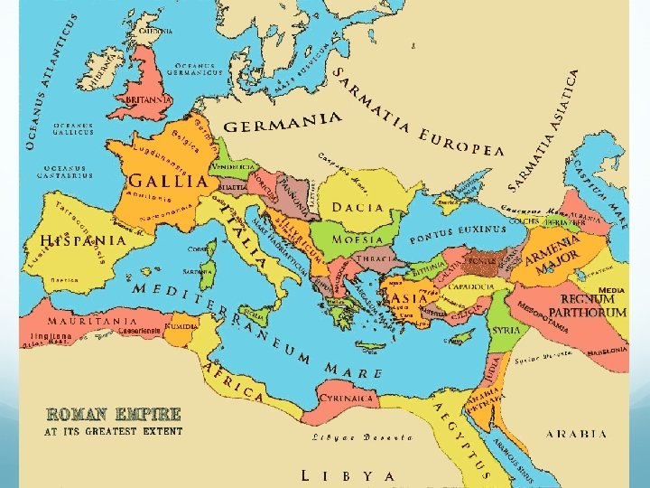 Rome Political 1. Etruscans 2. Roman Republic – Senate, 2 consuls, tribunes (plebeian reps) Punic Wars vs. Carthage 3. Triumvirates First: Caesar, Pompey, some other guy Second: Octavian, Antony, some other guy 4. Roman Empire Augustus (Octavian), Diocletian (divided) Economic Farming, taxes, trade Religious Polytheistic Social Two main classes: patricians (aristocrats) and plebeians (commoners), Intellectual Law of the Twelve Tables, Artistic Virgil (Poet, The Aeneid) Near (Geography) Mediterranean, Alexander’s empire (including Persia and Egypt), Germanic invasions from the north Christianity (Constantine)