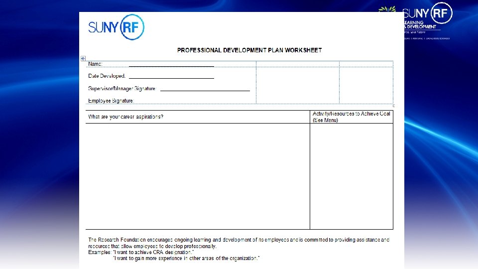 Potential Development Opportunities Outside Seminars / College Courses Self Directed Experiential Learning Improve Financial Acumen Self-Directed Knowledge Transfer Open Chair Staff meetings/ Department events Internal Workshops Mentoring Special Assignments/ Workgroups Books/ Readings Other – Your Good Ideas!
