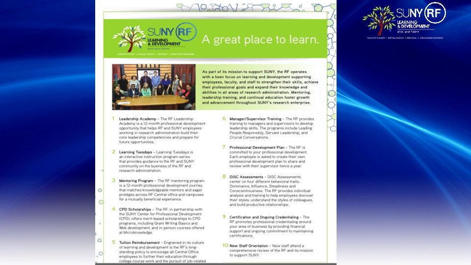 Engagement and Morale #1 reason employees leave their jobs because of their supervisor • • Engagement teams Business of the RF Research Symposium SPA fundamentals Mentoring program Leadership Academy Learning Tuesdays
