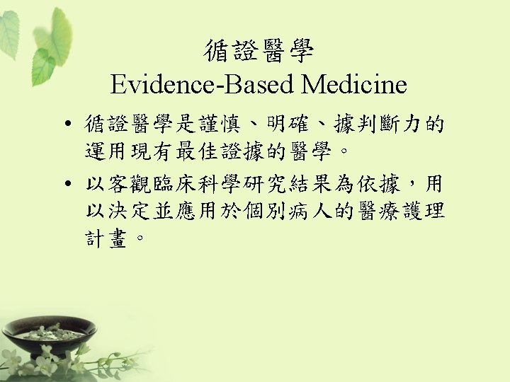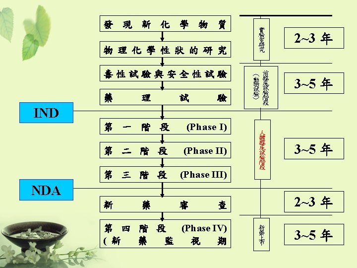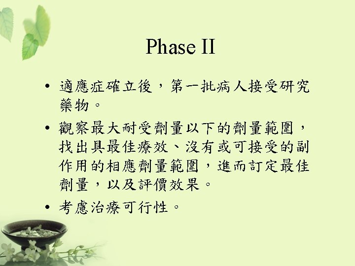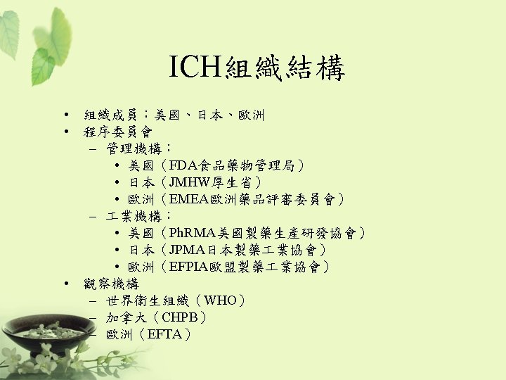 ICH 制定規範 • Q: “Quality” – Chemical and Pharmaceutical Quality Assurance • 安定性試驗 • S: “Safety” – In vitro and in vivo pre-clinical studies • E: “Efficacy” – Clinical studies in human subject • E 6 – GCP • E 8 – General considerations for clinical trials • E 9 – Statistical principles for clinical trials • M: “Multidisciplinary” – Not fit uniquely into one of the above categories
