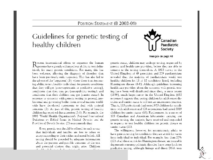 Genetic testing in children Informed consent is fundamental to genetic and genomic testing Decision to test a child is often made by a surrogate decision maker (e. g. parent, health provider) Canadian College of Medical Geneticists and the Canadian Pediatric Society published guidelines for genetic testing in healthy children in the clinical context (2003)