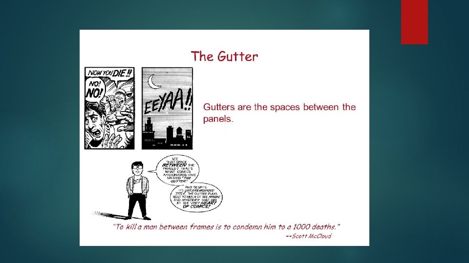 Different types of Gutter Moment-to-moment From one panel to the next panel, readers witness little closure and instead simply see something from one instance to the next.