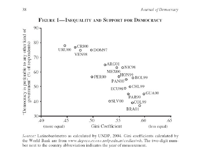 WHY ARE LATIN AMERICAN COUNTRIES POOR? Is it their own fault because of lousy political and economic choices? • Increasingly, experts point to problems of bad governance and the need for neoliberalism – What is the Washington Consensus? – What role did the IMF and to a much lesser degree the World Bank and the Inter-American Development Bank play in promoting the consensus – To what degree are models of state-led development replacing the Washington Consensus – How could trade reform make things better • Why is political reform so important to development? Are institutions and veto points the problem? Fukuyama’s comparison of the US and Latin America • Why were the Founders wrong about everyday people and democratic politicians most of the time? Why are populists the problem, but democrats the solution? • Building truly democratic governance is key to fighting corruption and limiting rent seeking regulations • Why do political scientists believe that both democratic stability and economic development requires investing substantially in human capital and allocating resources to the poorest… • Is Lat Am doing this well? Let’s see some data: