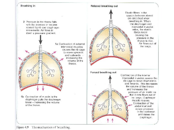 INSPIRATION EXPIRATION Atmospheric pressure = 760 mm. Hg Diaphragm & external intercostals contract Rib cage raised (upwards and outwards) Diaphragm lowered (becomes flatter) Volume of chest cavity increases Pressure in chest cavity drops to below atmospheric pressure to 758 mm. Hg Diaphragm & external intercostals relax Rib cage lowered Diaphragm raised (dome shape) due to push from abdominal organs Volume of chest cavity decreases Pressure in chest cavity increases to above atmospheric pressure to 763 mm. Hg Air moves into lungs from atmosphere Active process Air forced out of lungs into atmosphere Aided by elastic recoil and abdominal organs Passive process