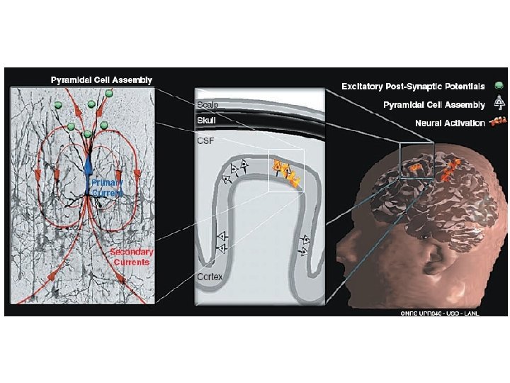 EEG and MEG Signals • EPSPs of parallel dendrites in cortical columns creates: – Primary current (what we want to know about) – Secondary/volume currents • Measured by EEG • Influenced by intervening tissue – Magnetic field perpendicular to primary current • Measured by MEG • Unaffected by intervening tissue