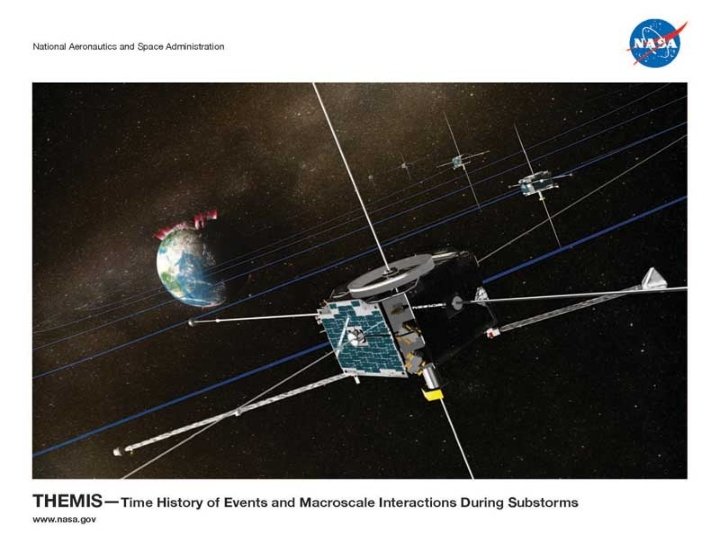 THEMIS Time History of Events and Macroscale Interactions during Substorms THEMIS will identify the mechanisms that trigger substorms which cause the Auroras. (UCB Space Science Laboratory, NASA, Swales Aerospace) • • • Launch date February 15, 2007 Two year mission 5 space probes 25 scientific instruments 20 ground observations