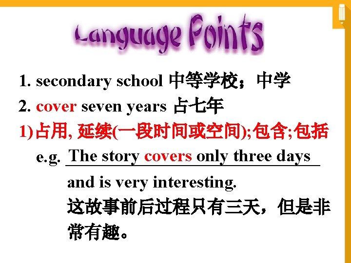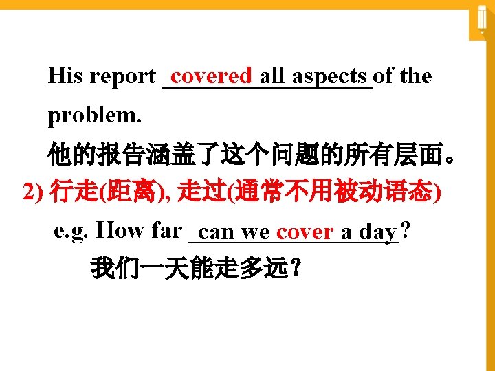 3) (钱)够用 e. g. Will 10, 000 dollars cover the bill ______? 1万美元足够付帐吗? 4) 采访……;报道 e. g. I’m covering the election campaign. 我正在报道选举活动。