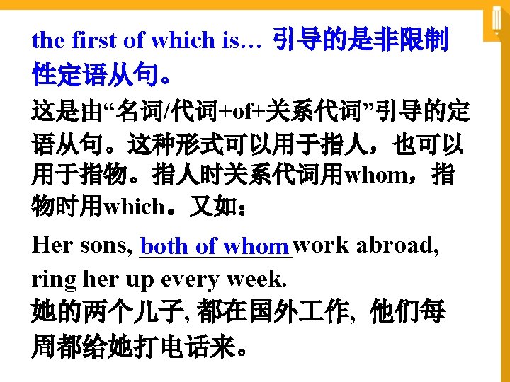 He went with a group of people, ______were correctly equipped for few of whom such a climb. 他和一组人一起去了, 其中没有几个人配 有进行这样一次登山的适当装备。 The buses, _______were already most of which full, were surrounded by an angry crowd. 公共汽车大多数都已经挤满了人, 它们被 愤怒的人群包围着。
