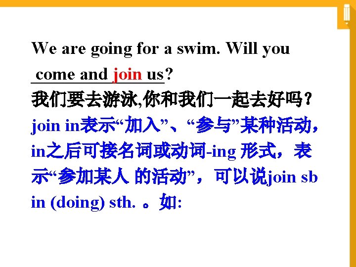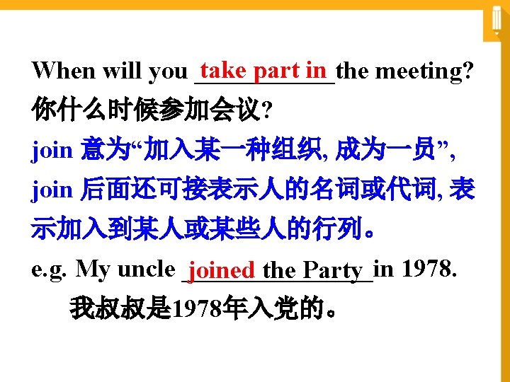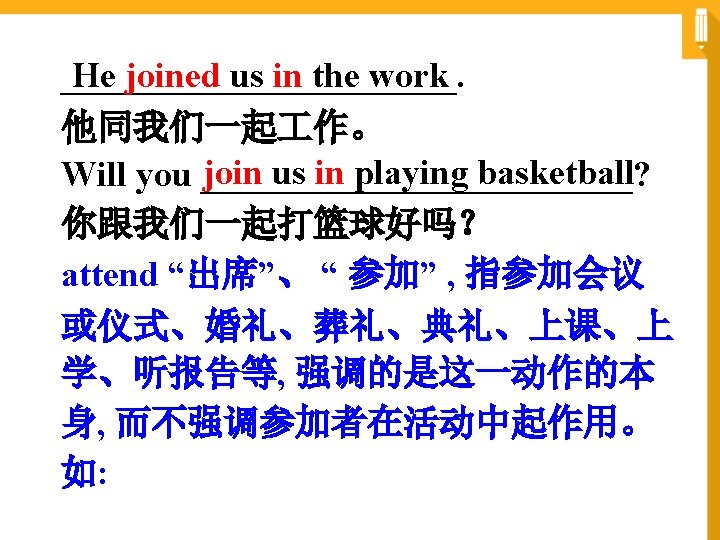 4. I take part in all kinds of after-school activities. take part in指参加会议或群众性活 动, 重在说明句子主语参加该项活动 并在其中发挥作用。 took part in e. g. The teacher ______our discussion yesterday. 昨天老师参加了我们的讨论。