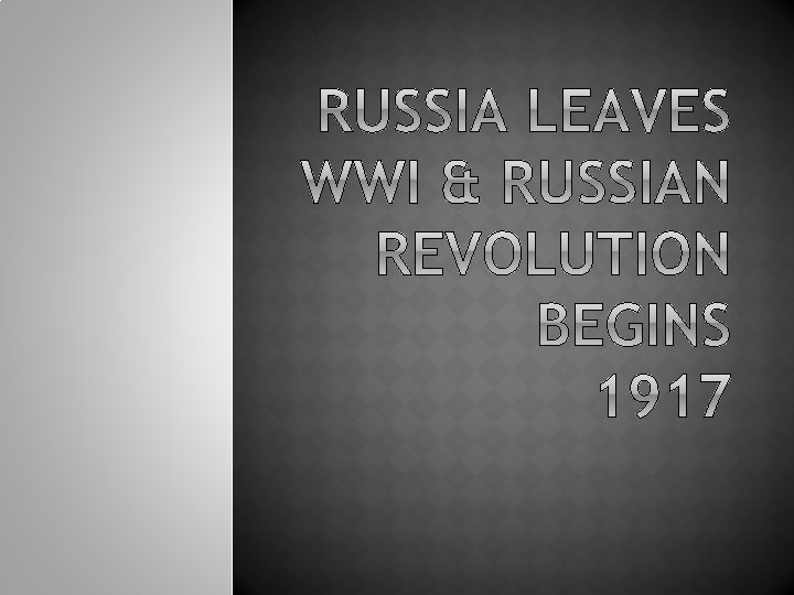 War extremely unpopular in Russia, despite successes in battle against Germany Huge death toll Losing territory Food shortages (remember this happened to another country? ) Russians thought had little to gain Russian Tsar Nicholas II even less popular. . . Offered Secret Had no reforms police wife rule while in battle