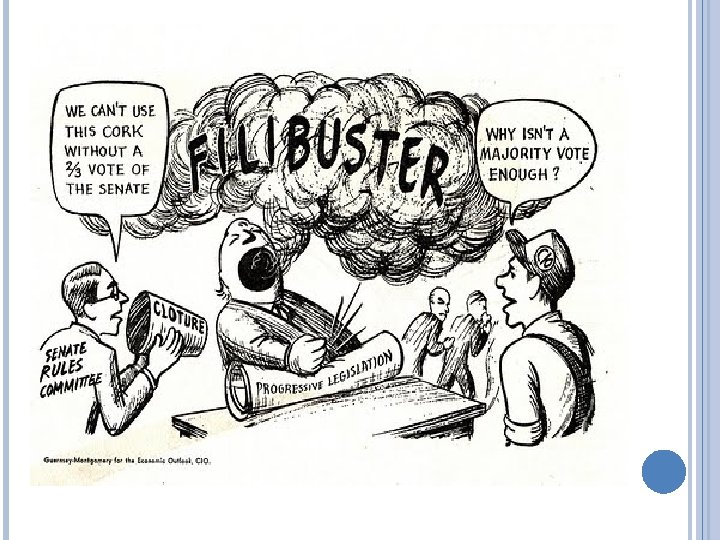 3. SENT TO THE FLOOR OF THE HOUSE FOR DEBATE House of Representatives Accept amendments relevant to the bill The House Rules Committee Sets time limits and rules for debate Senate Allow riders – completely unrelated amendments to be tacked on to the bill Less strict rules for debate filibuster: May only end if A) the bill dies B) there is a 3/5 vote for cloture which limits debate time