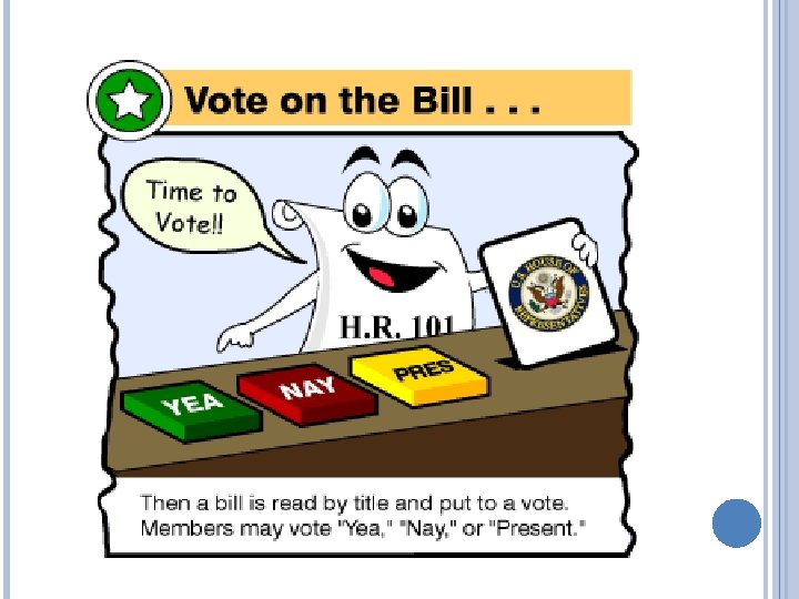 4) VOTE ON THE BILL Voice Vote- (yah or nay) – quick and easy but not precise B) Standing Vote – more precise, but individual votes not recorded C) Roll-call Vote – each individual’s vote is recorded; constituents know how their representative voted To continue on, the bill must receive a simplemajority of votes in favor of it A)