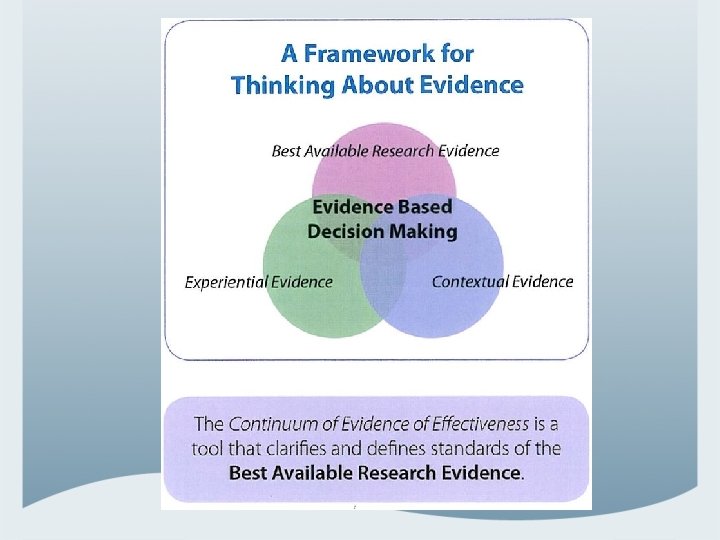 What Evidence? What Research? True Experimental, Randomized Control Trials in Different Settings & Populations vs. No research, no sound theory behind it (“way it was always done”), anecdotal evidence… PAGE 24