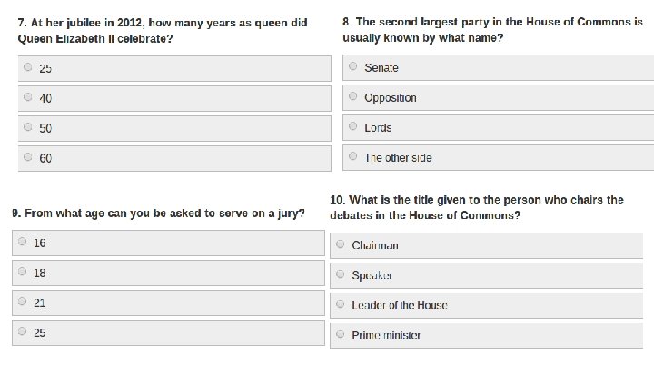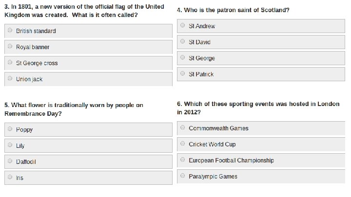 In groups, can you answer the next ten questions taken from the British citizenship test? Use A, B, C and D to answer.
