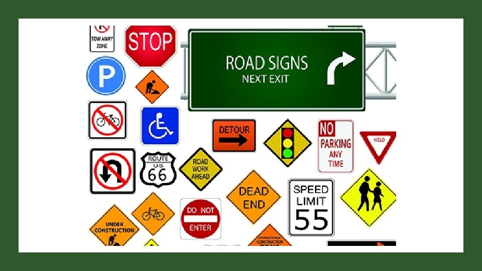 WARNING SIGNS Warning signs tell you that there may be dangers ahead. They are usually black on a yellow background are mostly diamond shaped. Pictures, diagrams and symbols are used to alert you to danger.
