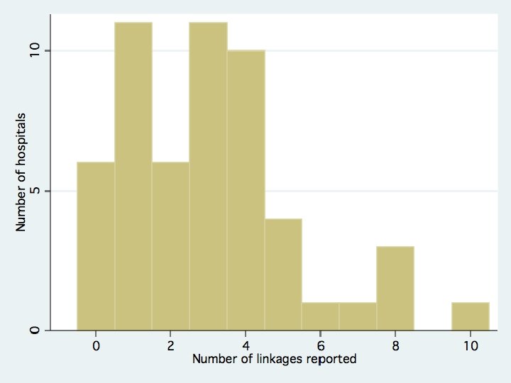 4. Effects of Interorganizational Linkages n n Inter-organizational linkages facilitate information and experience transfer; as such they help organizations learn from others’ experiences. Item in the PSO survey: n n The linkages tend to be: n n n Please list the hospitals/organizations you frequently engage in discussion or information sharing regarding patient safety Nearby hospitals/Teaching hospitals Professional associations: Ontario Healthcare Risk Management Network, Safer Healthcare Now!, Quality Healthcare Network, Canadian Patient Safety Institute Mean: 3 hospitals/organizations, min=0, max=10