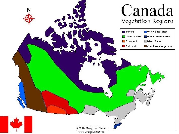 Vegetation Regions (Zones) Tundra: Northernmost region in Canada. Only contains small bushes, grasses and moss. West Coast Forest: A temperate rainforest which contains the largest trees in Canada Cordilleran: Vegetation varies by elevation (deciduous trees at the base of mountains, tundra near the top) Boreal and Taiga Forest: Region of coniferous trees which stretches across Canada Grassland: Region consisting of wild species of grasses, shrubs, and some small trees Mixed Forest: Region of Southern Canada containing coniferous and deciduous trees Deciduous: (Broad-leafed) Forest: Region of Southwest Ontario containing deciduous trees.