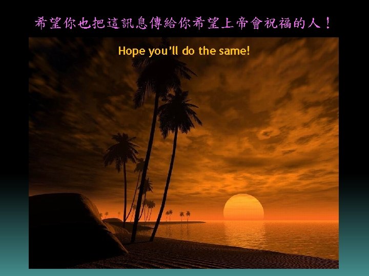 我把這訊息傳給我希望上帝會祝福的人, 故此我傳給你! I send this message to those whom I wish will receive God’s blessing, hence, I pass it to you.
