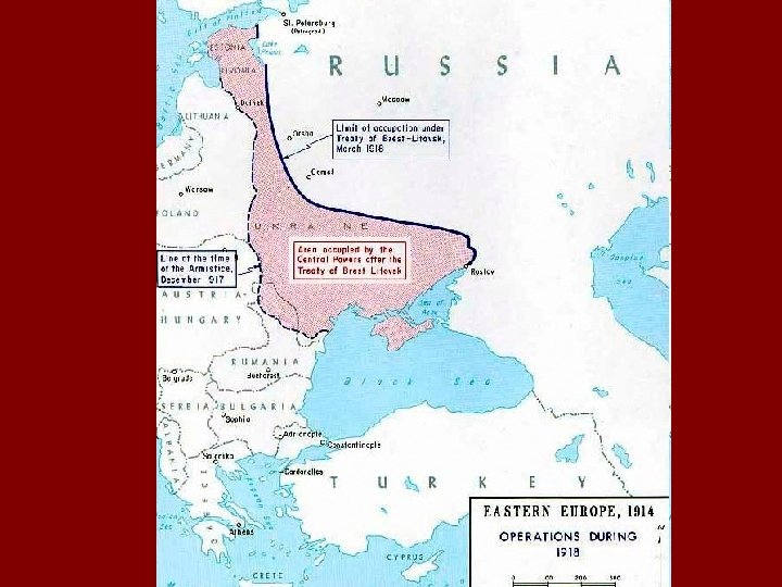 Treaty of Brest-Litovsk • Lenin had Russia sign a peace treaty with Germany, ending its involvement in WWI. Treaty of Brest-Litovsk, 1918