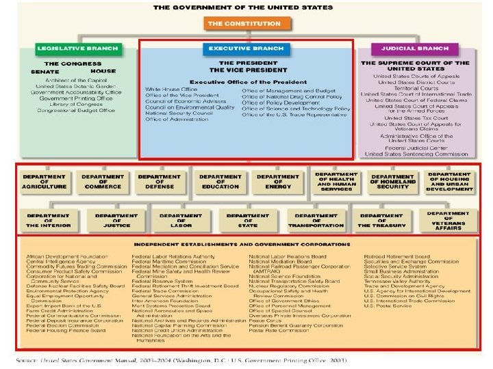 The Federal Bureaucracy Is… • 4 million employees; 2. 8 million are civilians or “civil servants” • President only appoints 3% (patronage or political appointments) • 15 cabinet level departments • 200+ independent agencies with 2, 000+ bureaus, divisions, branches, etc. • Biggest - Department of Defense, U. S. Postal Service, Veterans Administration • • QUESTIONS: With 4 million employees in 15 departments and hundreds of independent agencies, are you surprised by the size and scope of the federal bureaucracy? Why do you think it’s so big? If the president only appoints about 3% of the federal workforce, how much control do you think he has over the bureaucracy? Why do you think the Department of Defense is the biggest federal department?
