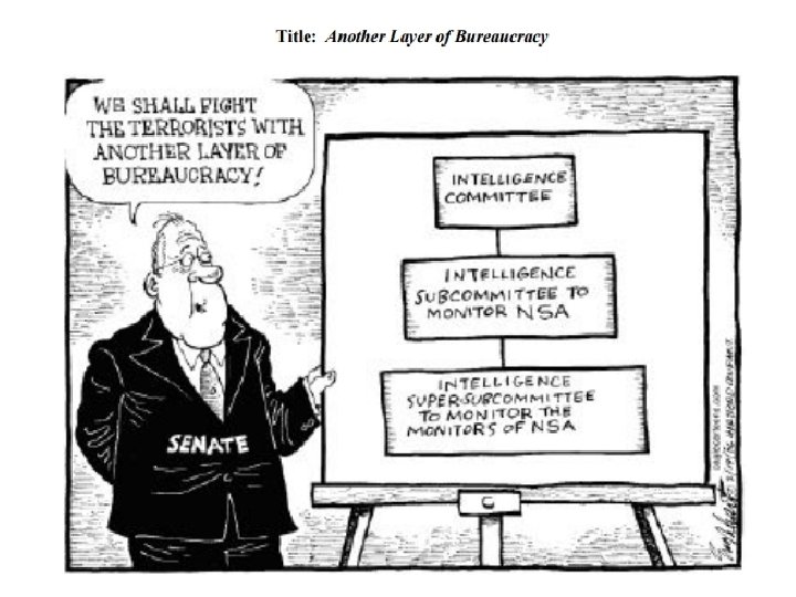 Criticisms of bureaucracy • RED TAPE – too many rigid procedures >>> ex: all hiring must be done through OPM – too many policies with no flexibility for special circumstances – too many forms to fill out, lines to wait • INEFFICIENCY – lack of incentive to be productive - no profit motive • DUPLICATION OF SERVICES – bureaucracy is so complicated – agencies are performing similar and sometimes the same functions – Dept. of Commerce overlaps with Dept. of Agriculture, GSA overlaps with Dept. of Interior, etc. – federalism makes this more complicated, many services are provided at the state and national level both • BUREAUCRACY IS LAW MAKER – regulations end up having the effect of law • BUREAUCRACY IS TOO BIG – privatization would be more effective • BUREAUCRACY IS CORRUPT – iron triangle - reveals the relationship between the Executive branch, Congress and private interest groups that can lead to decisions which benefit the private sector at the expense of the government.