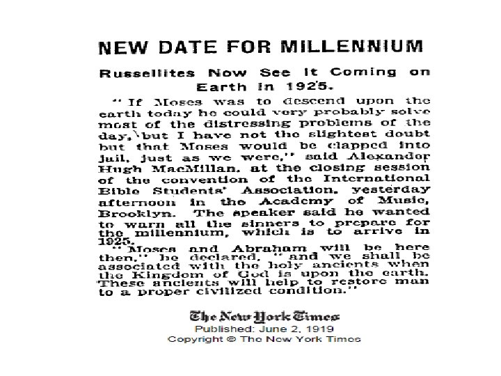 Charles Taze Russell (to 1916) • Raised as a Presbyterian, but did not like the doctrines of predestination and Hell • As a young adult came into contact with an Adventist preacher named Nelson Barbour • From Barbour he got the belief that Jesus had returned to Earth invisibly in 1874 and that His kingdom here would be fully established by 1914