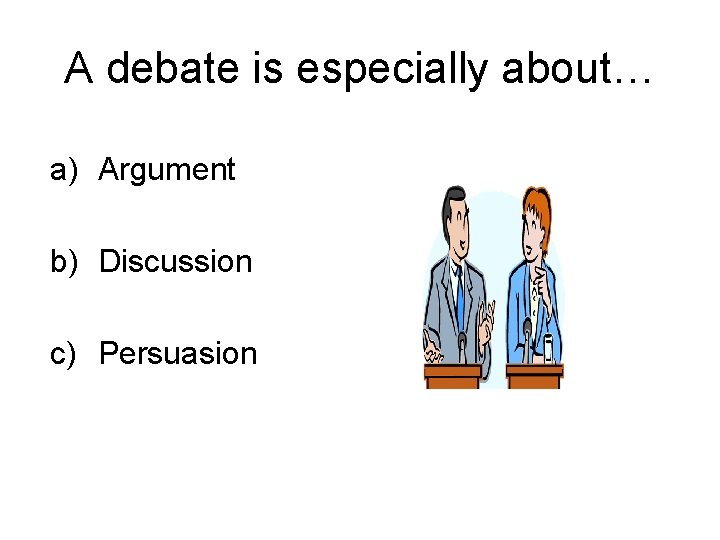A debate is especially about… a) Argument b) Discussion c) Persuasion