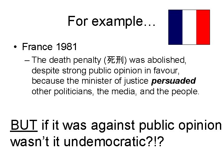For example… • France 1981 – The death penalty (死刑) was abolished, despite strong public opinion in favour, because the minister of justice persuaded other politicians, the media, and the people. BUT if it was against public opinion wasn’t it undemocratic? !?