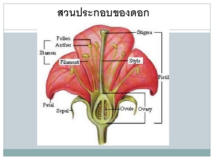 Flower Part Stamen Male part of the flower, consisting of the anther and filament, makes pollen grains. The stalk of the stamen which ) Filament bears(���� the anther. Anther The pollen bearing portion of a stamen. Pollen Grains containing the male gametes. Immature male gametophyte with a protective outer covering.