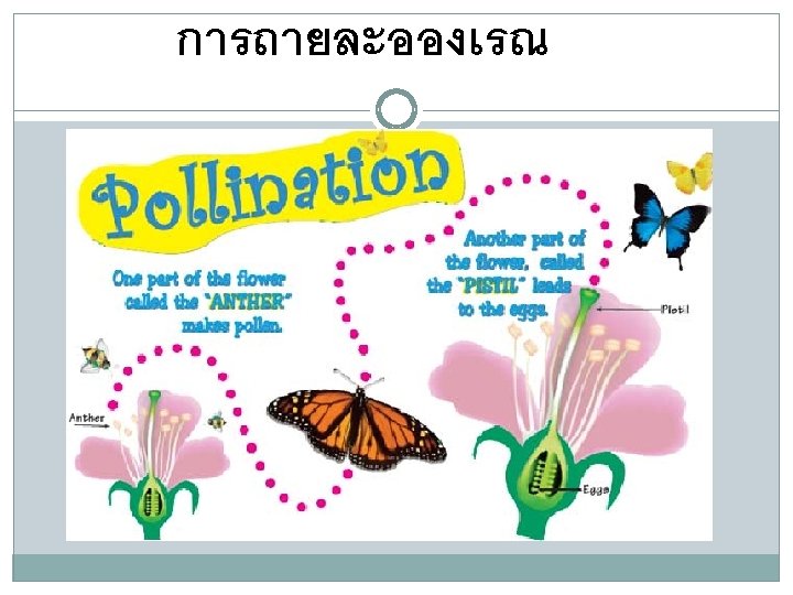 Pollination is the transfer of pollen (containing the male gametes), from the anther of a flower, to the stigma (receptive surface of the female part of the flower) of the same or a different flower.