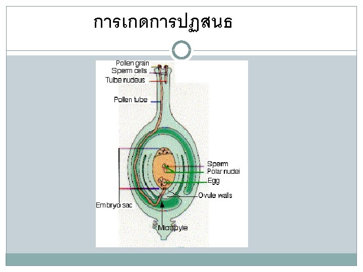 Fertilization Once a pollen grain reaches the stigma of another flower of the same species, it will produce a pollen tube. This grows down through the style until it reaches an ovule. Fertilization then takes place, resulting in a seed.
