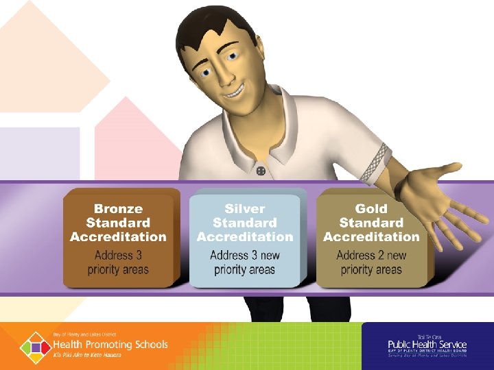 Silver Standard ‘Maintaining and Developing Health Promoting Schools’ • Maintain requirements for Health Promoting Schools Bronze Standard Accreditation • Implement and monitor an annual action and evaluation plan based on the needs identified (address a further three health and wellbeing priority areas) and demonstrate improvements • Include pandemic planning in the Health and Safety, Workplace and Emergency Management Plan • Strengthen parent/whanau engagement