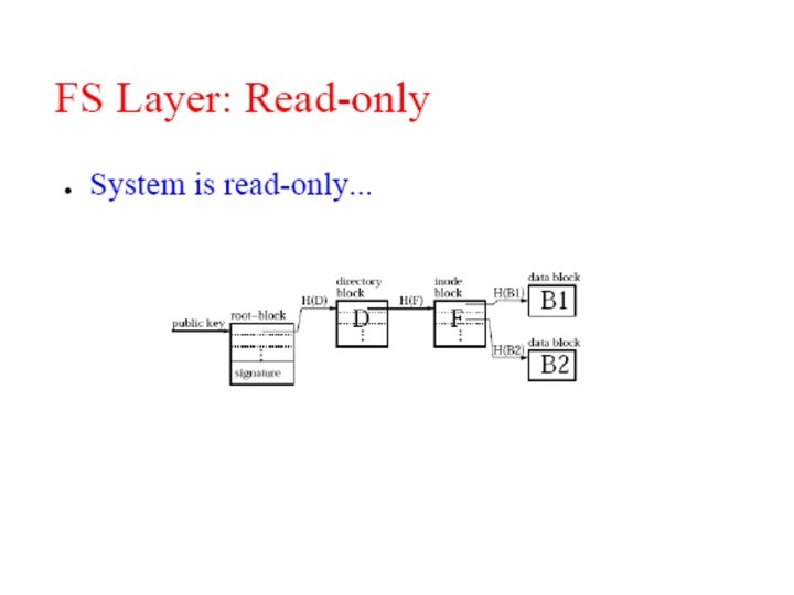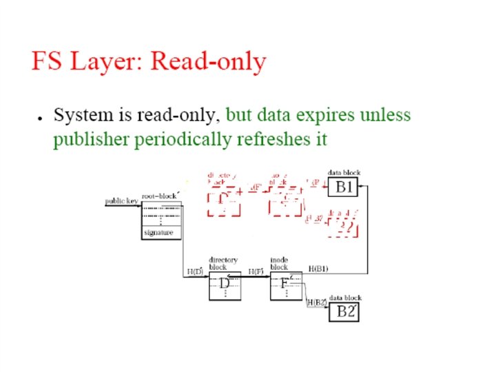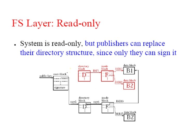 File representation: self-authenticating data File System key=995 995: key=901 key=732 Signature (root block) 431=SHA-1 144 = SHA-1 … 901= SHA-1 key=431 “a. txt” ID=144 key=795 … (i-node block) … (data) … (directory blocks) Signed blocks: – Root blocks; Chord ID = H(publisher's public key) Unsigned blocks – Directory blocks, inode blocks, data blocks; – Chord ID = H(block contents)