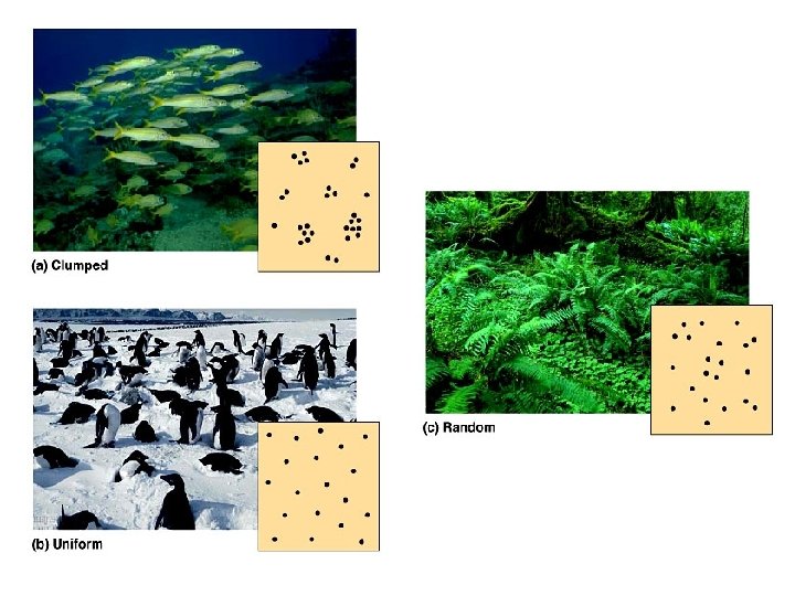 Population Density • # of organisms per area • Dispersion – pattern of spacing of populations – 3 types • Uniform • Clumped • Random
