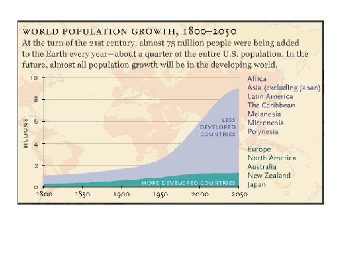 Human Population Growth http: //www. census. gov/popclock/ • It took all of human history up to the early 1800 s for world population to reach 1 billion people • until 1960 to reach 3 billion • Today, the world gains 1 billion people every 11 years • The current population is almost 8. 5 times larger than the population of 760 million at the beginning of the Industrial Revolution • At current growth rates, the world population could double in as little as 58 years