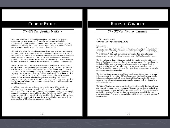 Why Ethics of Concern for GIS? ► Vendors: warranty, user documentation transparency and ethics of selling systems ► Data providers: Standards and compliance, Copyright & IPR ► Researchers: veracity, scholarship, product endorsement (is it right to publish work that uses the intellectual achievements of others without acknowledgement?