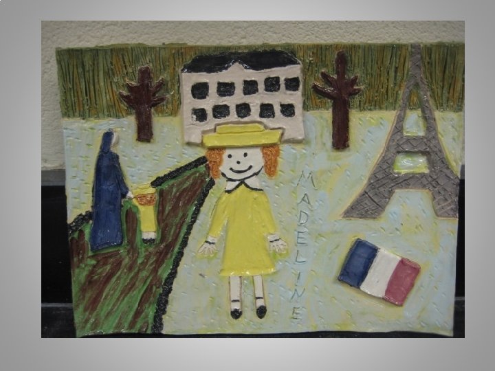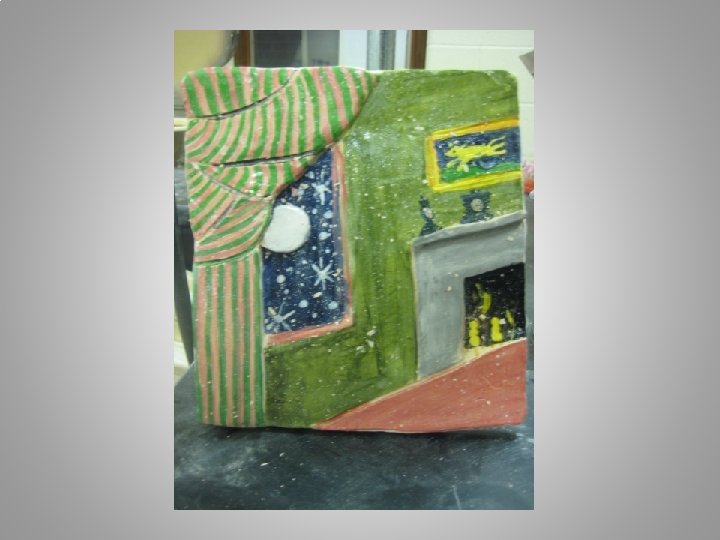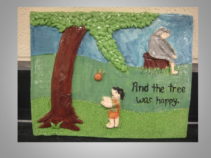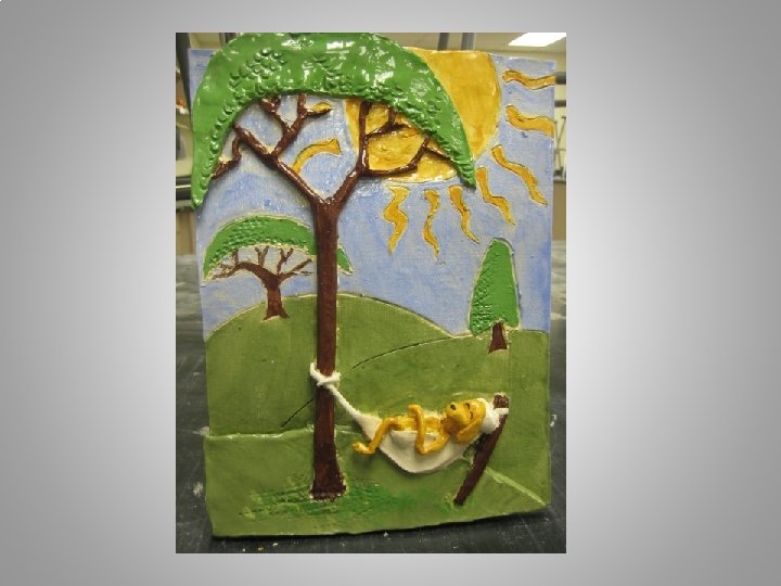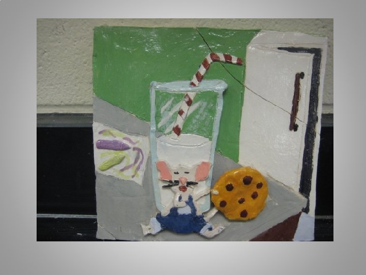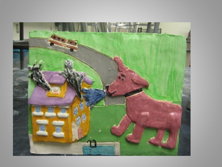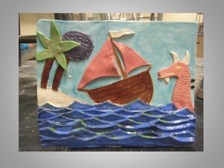 OBJECTIVES: Composition: Recognizable storybook scene is created using a newly created composition of characters and events from the book. Perspective: Student illustrates perspective in the composition by incorporating a fore, mid and background. Sculpting: Adding clay and relief sculpture are incorporated in work. Sculpture is detailed and precise. Sculpture enhances perspective. Glaze Application Underglaze is applied with care and further illustrates details of work. Enhances details. Creative use of color. Proper technique. Challenge, Effort, and Craftsmanship