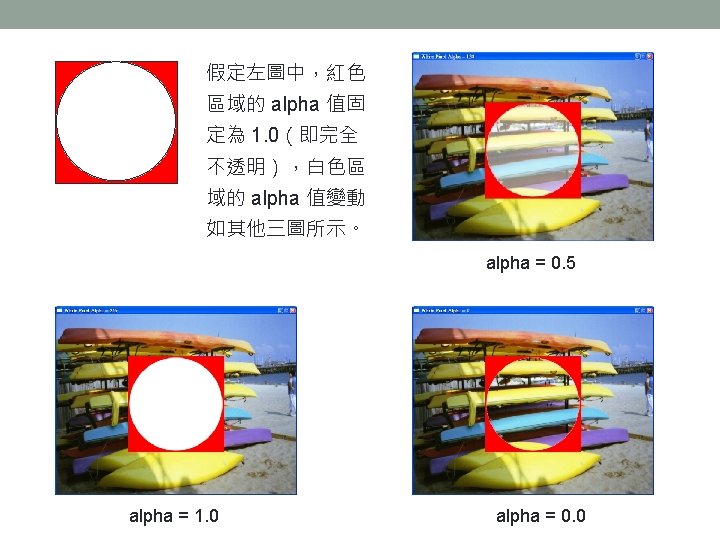 Alpha Blending Destination(目標) 紅色區域 alpha = 1. 0 白色區域 alpha = 0. 5 Source(來源)