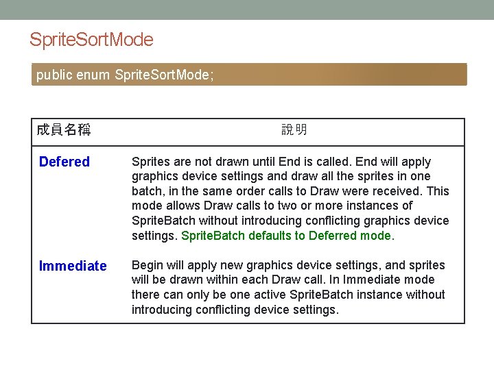 Sprite. Sort. Mode public enum Sprite. Sort. Mode; 成員名稱 說明 Defered Sprites are not drawn until End is called. End will apply graphics device settings and draw all the sprites in one batch, in the same order calls to Draw were received. This mode allows Draw calls to two or more instances of Sprite. Batch without introducing conflicting graphics device settings. Sprite. Batch defaults to Deferred mode. Immediate Begin will apply new graphics device settings, and sprites will be drawn within each Draw call. In Immediate mode there can only be one active Sprite. Batch instance without introducing conflicting device settings.
