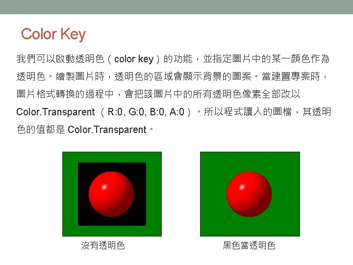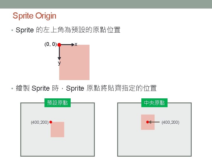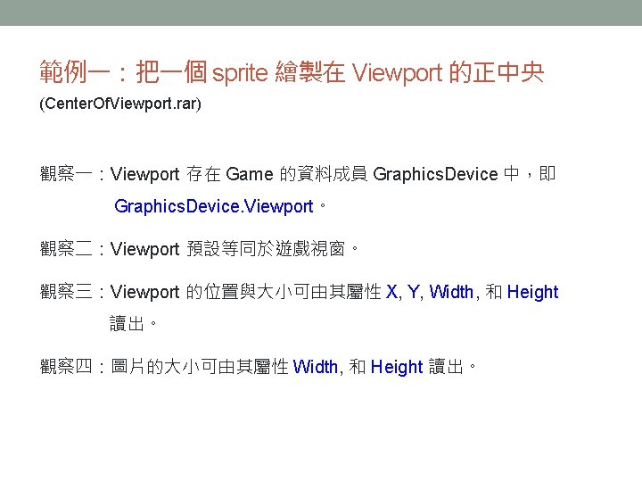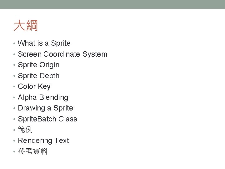 大綱 • What is a Sprite • Screen Coordinate System • Sprite Origin • Sprite Depth • Color Key • Alpha Blending • Drawing a Sprite • Sprite. Batch Class • 範例 • Rendering Text • 參考資料